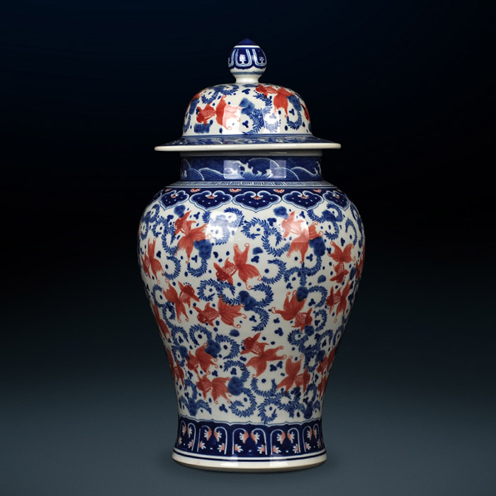 Hand painted blue and white underglaze red ceramic storage jar kitchen