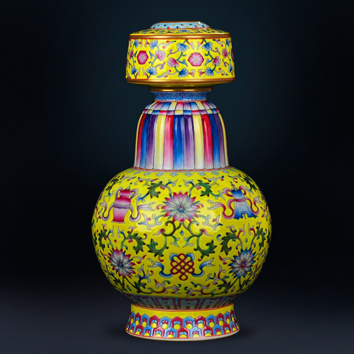Vintage qing qianlong yellow background pastel ceramic pot with flower