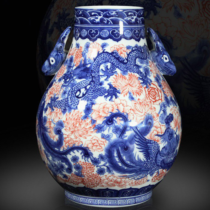 Blue and white underglaze red flowers vase with dragon and phoenix