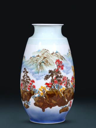 Large hand painted landscape painting red in glaze porcelain vase