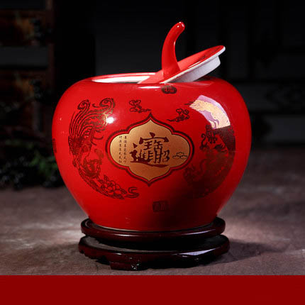 Dragon and Phoenix Pattern Apple Shaped big red Ceramic Storage Jar