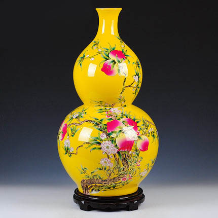 Peaches pattern yellow gourd shape ceramic vase on the ground
