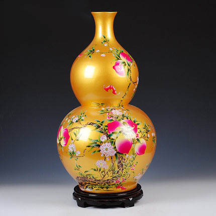 Golden gourd shape ceramic vase with peach pattern on the ground