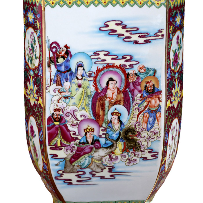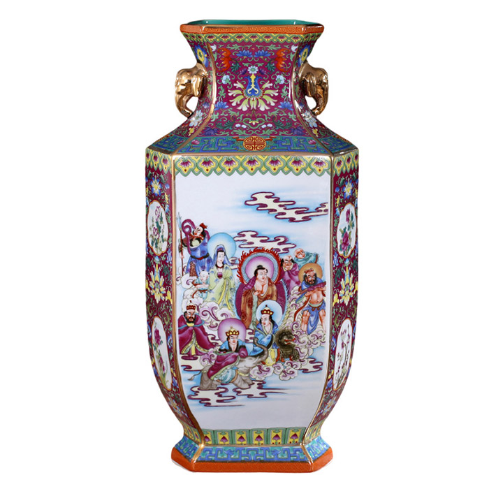 Large qing dynasty qianlong enamel vase with eighteen arhats painting