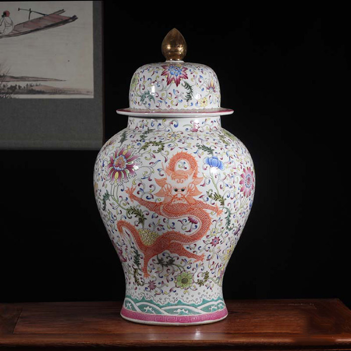 Extra tall colorful dragon and phoenix lucky ceramic jar living room