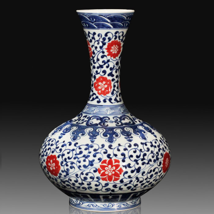 Hand-painted blue and white underglaze red tangled lotus ceramic vase