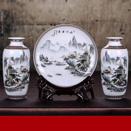 3-piece ceramic hanging plate and vases with mountains and rivers