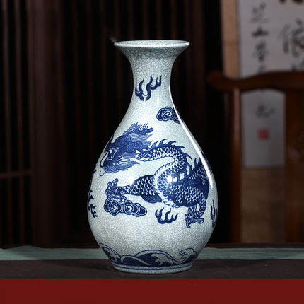 Cracked glazed blue and white ceramic dragon flower vases living room