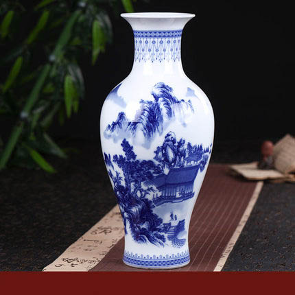 In-glaze landscape and pavilion pattern fishtail shape ceramic vase