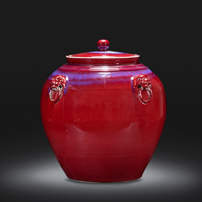 Red pottery kiln changed to lion head storage jar with lid in kitchen