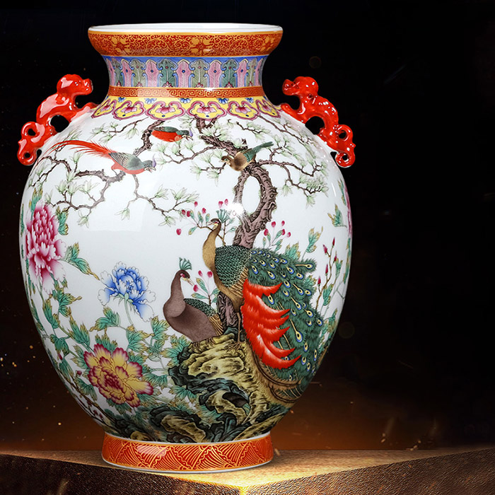 Vintage qing dynasty qianlong enamel double ear ceramic vase decor