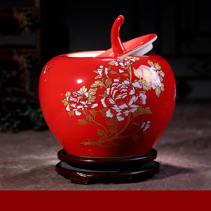 peony flower pattern apple shape red ceramic storage jar