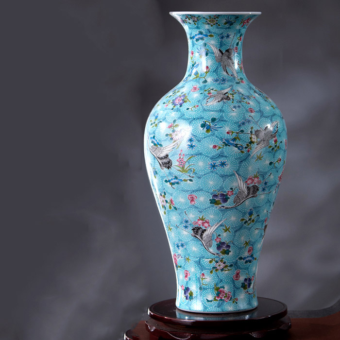 Vintage chinese blue ceramic vase with birds and flowers living room