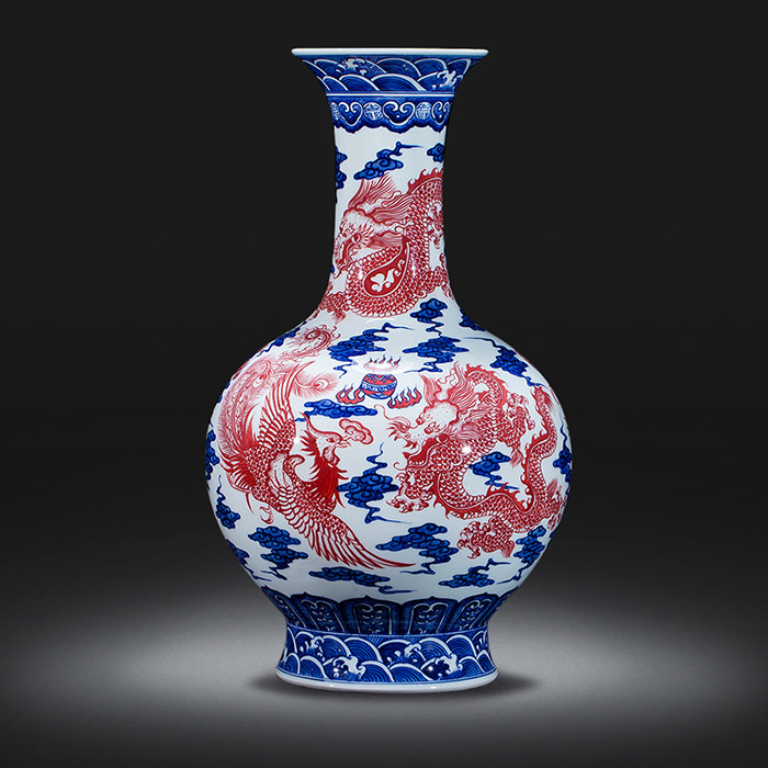Vintage qing dynasty qianlong blue and white underglaze red ceramic vase with dragon and phoenix