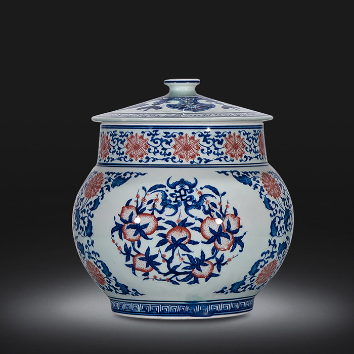 China hand painted blue and white underglaze red ceramic jar with lid