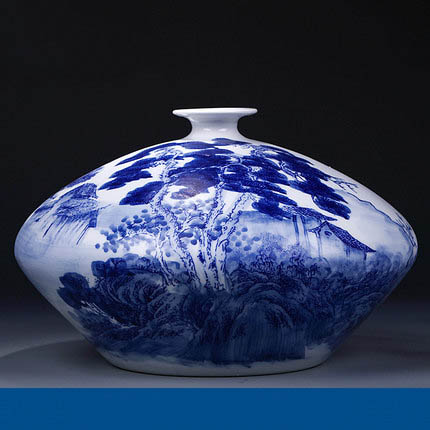 Master hand-painted flat belly-shaped blue and white porcelain vase